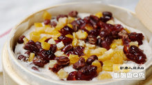 5. 把鬆糕分二次倒入蒸籠內,鋪滿後上面再撒上水果蜜餞及蜜紅豆粒