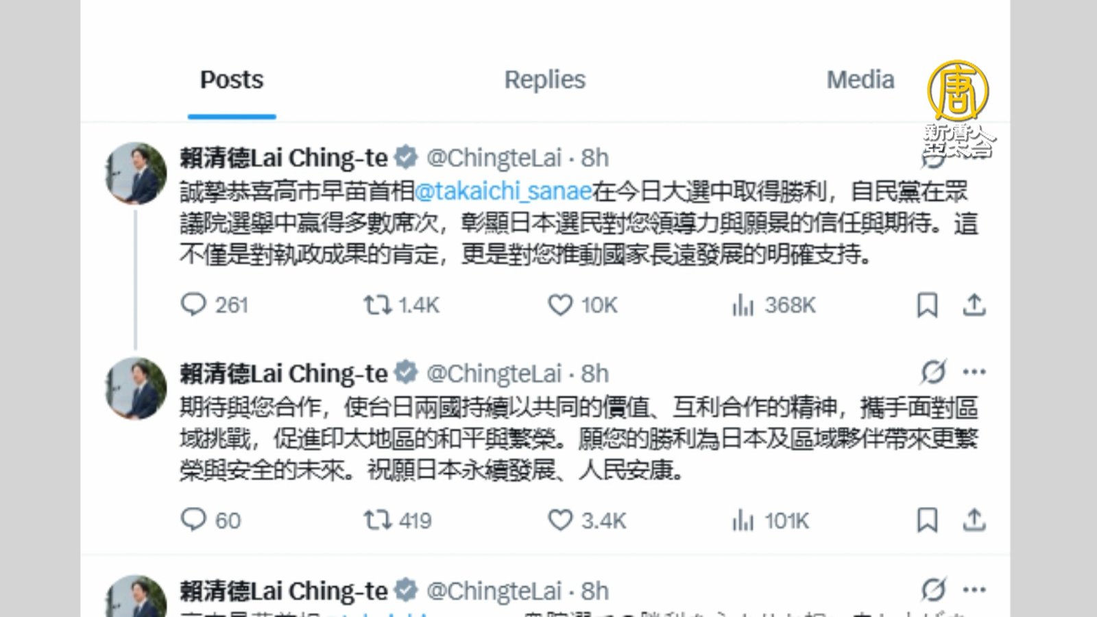 2026-02-09 07:20:31高市早苗領軍執政黨自民黨選舉大勝,中華民國總統賴清德昨晚發文恭賀高市取得勝利,賴總統表示,這彰顯日本選民對高市早苗領導力與願景的信任與期待,期待台日持續攜手,共促印太地區的和平與繁榮。
