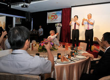 呂分處長(台上左)與金屬工業研究發展中心董事長林仁益(台上右)舉杯祝福所有與會貴賓