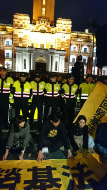 隨後時代力量離開議會,來到了凱道,並和警方在凱道展開追逐,警察一度手拉手阻擋,無效,時力布條也遭扯斷。5位立委隨即在總統府前靜坐抗議!