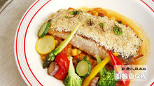 2.     鍋中放橄欖油,魚皮朝下放入鍋中,煎至金黃。拿起鋪上麵包粉,加些胡椒鹽調味,放入烤箱180度烤3分。