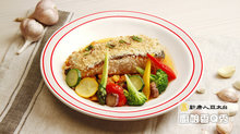 食材:鮭魚(40克)麵包粉(12克)蒜頭(6克)胡椒鹽(2克)黃綠櫛瓜(30克)蕃茄糊(7克)洋蔥(8克)花椰菜(6克)番茄糊(7克)時蔬、橄欖油適量