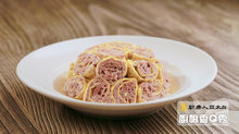 6. 將切好的蛋捲依序排列在碗裡,中間塞入燙好的娃娃白菜,加入少許的鹽,與雞高湯,一同入蒸籠,蒸10分鐘。