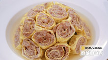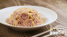 3. 取一張蛋皮,將調味好的豬絞肉,均勻塗抹在蛋皮上,用手沾點水灑豬絞內上,再由下往上捲,可灑些麵粉依序捲,進蒸籠蒸10分鐘。