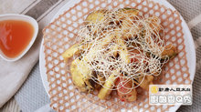 2.乾麵線先燙熟瀝乾,再入160℃油溫小火炸至金黃色,炸時要稍撥散麵線。瀝油備用。