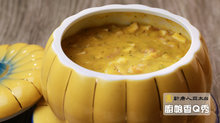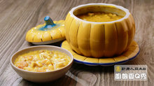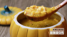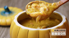 食材:南瓜800g、洋蔥丁60g、培根丁30g、杏鮑菇丁100g 、蝦仁 100g、蟹管肉60g、大骨蔬菜高湯1000g
