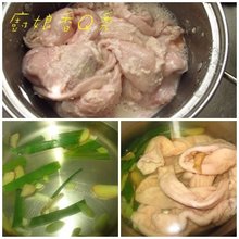 3. 用冷水沖大腸,再放到有蔥和薑、米酒(1大匙)的熱水鍋中煮10分鐘