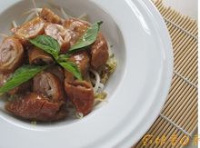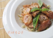 6. 大腸切好擺在綠豆芽上,再淋上滷汁