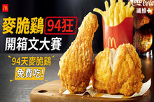 為讓更多人享受麥脆鷄獨特魅力,明(3)日18:00起至7月31日23:59止,台灣麥當勞將舉辦「麥脆鷄94狂開箱文大賽」,廣邀各路粉絲一起大啖麥脆鷄,以自身專業、多元角度發表最有趣的「百工百業」開箱文,並將選出5名最有創意、獨具一格的開箱好手,每名贈送一張特製麥脆鷄點點卡(預儲點數,可兌換94份「麥脆鷄腿(2塊)」經典套餐,市值為15,040元),免費享有94天的麥脆鷄套餐。