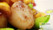 4. 將煎香的干貝加入鍋中熱炒後勾芡,放入紅黃甜椒及海鮮醬,上些許香油提香亮色。將成品盛入已放好甜豆的容器後完成。
