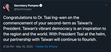 蓬佩奧也親自推特推文,「恭喜蔡英文博士,開始台灣總統的第二任期。台灣活力蓬勃的民主制度,啟發了該區域乃至世界。在蔡總統的領導下,我們與台灣的伙伴關係將繼續蓬勃發展。」