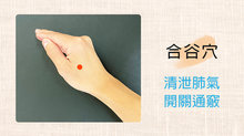 ●合谷穴:合谷穴位於拇指食指併攏時,虎口部隆起最高處,能清泄肺氣,開關通竅。