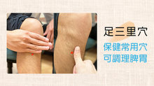 ●足三里穴:足三里穴位於小腿前外側,外膝眼(犢鼻穴)下方3寸,脛骨前緣外衣橫指(拇指寬度)處。膝蓋骨外側下方凹陷往下以食指、中指、無名指、小指併攏,取小指下方及脛骨前緣外側1個姆指寬交界處,為保健常用穴,可調理脾胃。