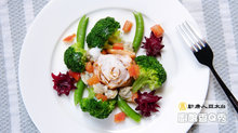 5.把蔬菜料燙熟,用平底鍋略炒調味,再把鮭魚花、蔬菜擺盤,淋上奶泡醬汁即可。