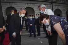 【新唐人亞太台 2020 年 08 月 09 日訊】前總統李登輝辭世,日本前首相森喜朗今(9日)率日本國會跨黨派議員來台弔唁!弔唁團在下午2時33分降落於松山機場, 4點前往總統府晉見總統蔡英文,之後才到台北賓館追思,在台灣短暫停留約3個半小時,隨即返回日本,全程團進團出遵守防疫措施。