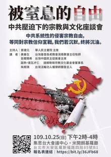 【新唐人亞太台 2020 年 10 月 18 日訊】「被窒息的自由-中共壓迫下的宗教與文化座談會」10月25日將在台北登場;解析中共系統性迫害各宗教信仰及滅絕群體與文化的現況、侵害信仰與文化的手法、世界的覺醒與圍堵、建言台灣的因應之道。