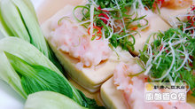 食材:雞蛋豆腐300公克、青江菜150公克、白表粒30公克、草蝦仁120公克、蔥絲20公克、薑絲10公克、辣椒絲10公克、魚露20公克、醬油20公克