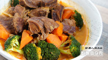 食材:美國牛條肉300公克、洋蔥60公克、紅蘿蔔100公克、紅蔥頭10公克、青花菜120公克、哈司麵包100公克、椰漿5公克、薑黃粉2公克、紅咖哩10公克、罐頭番茄100公克、椰漿100公克