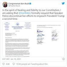 數名共和黨眾議員聯合致信給當選總統拜登,信中呼籲,本著治癒和忠於憲法,我們要求拜登正式要求斐洛西眾議長停止第二次彈劾總統川普的行為。