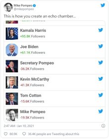 蓬佩奧再次附圖推文譏諷推特說:「這就是你們創建的回音室。」