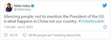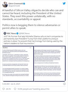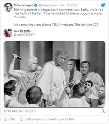 蓬佩奧在個人推特帳號發文說,「禁言是危險的,這麼做不是美國的風格。可悲的是,這並不是左派的新招數了。他們多年來一直在讓反對派銷聲。」