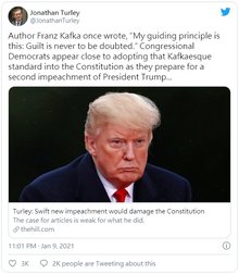 週六(9日),喬治華盛頓大學法學院法律教授(Jonathan Turley)發推文說,「雖然我強烈批評(川普)總統的言論,但他實際上從來沒有呼籲過暴力或暴動。事實上,他明確地告訴追隨者『要』和平地、愛國地發出你們的 『聲音』。這種遊行在聯邦和州議會大廈都很常見。」
