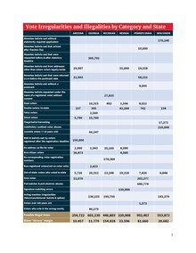 納瓦羅的第三份報告,具體統計了美國大選六個關鍵州,亞利桑那州、喬治亞州、密西根州、內華達州、賓州以及威斯康辛州,有多少潛在的非法或違規的選票。報告中的第一個圖表,列出了26種不合理卻又被計入的選票,不在籍選票(Absentee ballots)違規的方式就有7個種類,還有冒名死者投票、簽名核對錯誤、以及選民在錯誤的選區投票等。