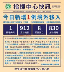 【新唐人亞太台 2021 年 02 月 01 日訊】中央流行疫情指揮中心今(1)日公布國內新增1例境外移入中共肺炎(COVID-19)確定病例(案913),自日本入境。