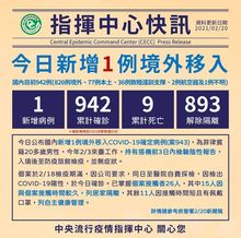 【新唐人亞太台 2021 年 02 月 20 日訊】中央流行疫情指揮中心今(20)日公布國內新增1例境外移入中共肺炎(COVID-19)確定病例(案943),為菲律賓籍20多歲男性,今(2021)年2月3日來臺工作,持有搭機前3日內檢驗陰性報告,入境後至防疫旅館檢疫,並無症狀。