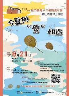 【新唐人亞太台 2021 年 08 月 10 日訊】暑假宅在家悶壞了?不妨參加各類夏令營,讓暑期生活不留白!金門縣教育處8/21(六)辦理線上夏令營「今夏與鱟相遇」,帶領國小3至6年級學童透過鏡頭逛海邊,尋找「鱟」的足跡!明起(8/11)開放報名,額滿為止。