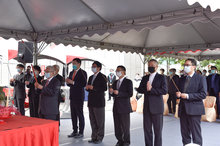 永豐餘集團前總裁何壽川(中)、竹科管理局局長王永壯(右三)、元太科技董事長李政昊(左三)及貴賓進行元太科技新廠動土儀式。(竹科管理局提供)