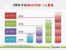 國健署公布最新國人癌症登記報告,108年新增罹癌12萬1254人,平均每4分20秒就有1人罹癌,與107年相較,罹癌人數增加5123人,罹癌時鐘快轉了11秒。在癌症排行榜中,大腸癌連14年位居第1,108年共1萬7302人罹患大腸癌。
