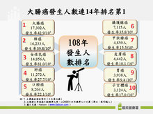 國健署今(13)日上午公布國人10大癌症排行榜,依次為大腸癌、肺癌、乳癌、肝癌、口腔癌、攝護腺癌、甲狀腺癌、皮膚癌、胃癌、子宮體癌,排序與107年相同。其中,大腸癌108年共1萬7302人罹患,蟬聯14年榜首。