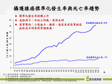 2015-04-14 20:54:09國健署14日公布,最新台灣癌症排行榜,統計101年的資料,大腸癌第七度奪冠,第二名肺癌、第三名為肝癌,女性子宮頸癌,則首度脫離前10名,但罹癌人數,持續增加,時間也比前一年縮短14秒,每5分鐘26秒,就有1人確診罹患癌症。