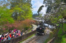 櫻花大道民眾搶拍蒸汽火車風采(黃源明提供)