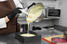 4. 將一半蛋白霜加入步驟2的麵糊中,用刮刀或打蛋器輕輕「切拌」,動作要輕柔以免蛋白霜消泡,一邊混拌一邊轉動鋼盆。混合後再倒入另一半蛋白霜,同樣以「切拌」方式拌勻,直至看不到蛋白霜。這時麵糊質地看起來膨鬆飽滿就是成功的麵糊。