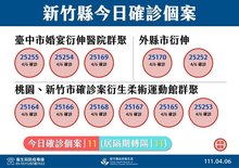竹縣衛生局說明,台中婚宴延伸醫院群聚案,今天新增的3例確診分別為案25169(護理佐理員)、案25254(病患)和案25255(病患),均在日前護理師案23409確診時即匡列居家隔離,醫院持續高頻率採檢,昨陰轉陽,醫院全院862人匡列採檢已完成,陸續找出陽性個案,持續落實感染管控措施。醫院累計31人確診,包含1名護理師、1名護理佐理員,和29名病患。