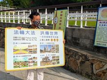 悠揚的煉功音樂響起,法輪功學員雙盤而坐煉起靜功,背後斗大的字眼「720反迫害—停止迫害法輪功」引起遊客注目。負責拉橫幅的學員顏先生未滿18歲就開始抽菸,是朋友口中的老菸槍,沒想到邁入中年後,因緣際會修煉起法輪功,自然而然戒掉了菸癮,修煉至今七、八年了,沒再抽過一根菸。他透露,從得法第一年就每個月抽空到日月潭景點講真相,今天也是特地請假來參加反迫害活動。他說,「很多人還不知道真相,我們就必須洪法,讓世人都知道法輪功是被迫害的,我們是修真、善、忍的,是一群善良的人。」