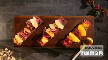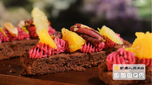6. 切4*4公分方塊,2.5*7公分,裝飾黑醋栗奶油霜,表面再放上柑橘皮絲及瓣、堅果。