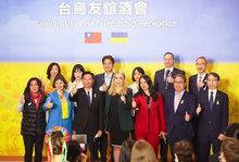 台灣烏克蘭友誼酒會26日在台北賓館舉行,外交部長吳釗燮(前左3)、烏克蘭國會議員盧狄克(前中)、立陶宛國會歐洲事務委員會副主席帕維里歐尼斯(後右2)等人合影留念。(圖/中央社)
