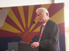 台積電創辦人張忠謀(圖)6日在亞利桑那州鳳凰城的移機典禮上台致詞。(圖/中央社)
