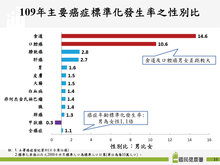 109年台灣男性新發癌症人數為6萬3893人,男性10大癌症發生率分別為大腸癌、肺癌、口腔癌(含口咽、下咽)、肝癌、攝護腺癌、食道癌、胃癌、皮膚癌、白血病、非何杰金氏淋巴瘤。從中可發現109年與108年排序相同,雖然男性大腸癌發生率下降,但仍蟬聯11年冠軍,且胃癌、白血病、非何杰金氏淋巴瘤標準化發生率有上升趨勢。