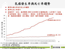 由於女性乳癌標準化發生率近年呈上升趨勢,國民健康署提醒,乳癌高危險因子包括老化、基因變異(BRCA1和BRCA2遺傳基因)、生育因子(初經早或停經晚、晚生、未哺乳)、家族史、有異常或良性乳房疾病(性囊腫乳腺炎、纖維瘤、纖維囊腫等、乳房細胞組織增生「尤其是非典型增生」)、乳房較緻密、輻射線的曝露、缺乏運動、肥胖、服用荷爾蒙、酗酒等,女性應小心注意自身健康。