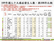依據最新衛生福利部109年癌症登記報告,國人10大癌症排行榜,依次為大腸癌、肺癌、女性乳癌、肝癌、口腔癌(含口咽、下咽)、攝護腺癌、甲狀腺癌、胃癌、皮膚癌、非何杰金氏淋巴瘤,除了胃癌與皮膚癌、子宮體癌與非何杰金氏淋巴瘤序位互換,其餘排序與108年相同。