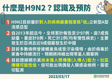 疾管署說明,自2013年起國際間持續報告零星人類感染H9N2案例,迄今累計報告至少97例,逾7成為幼童,重症計8例,死亡計2例(均有慢性病史),主要發生於亞洲且近9成個案發生於中國,最近1例為2022年11月中國湖南省輕症病例。WHO 2023年2月24日針對H9N2風險評估表示,目前多數病例曾接觸禽鳥或受汙染環境,由於病毒於家禽中持續流行,預期將持續出現零星人類案例,惟目前證據顯示其沒有人傳人能力,社區傳播可能性低,但可能出現偶發人類感染病例,需密切監測。H9N2目前屬於對人的疾病嚴重程度為「低」之新型A型流感亞型。