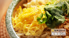 5. 麵上再放上蛋絲、小黃瓜絲、熟的花生碎及白芝麻,最後以香菜點綴完成。