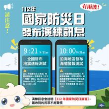 在演練訊息中,氣象署會明確標示「112年國家防災日演習」,請民眾接到訊息後不要驚慌,並且自行演練避難相關措施,包括趴下、掩護、穩住。