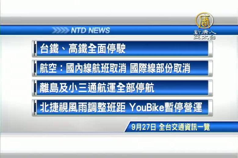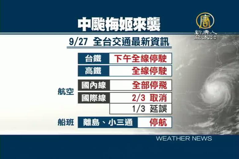 接著帶您關心,梅姬颱風的最新交通異動情況,目前,台鐵、高鐵已經全面停駛,高鐵明天下午兩點將恢復營運。在航空運輸部分,國內線航班全部停飛,國際線有三分之二航班取消。另外,北捷除了文湖線和高架路段停駛之外,北捷與高捷都正常營運。 在公車部分,台北、高雄、台中公車,從今天下午開始,全面停駛。 國道客運也全面停開,另外,YouBike也停止營運。 //asset3.ntdtv.com.tw/public/uploads/assets/2016/09/27/2016-09-27-57ea62e639d18.mp4 梅姬颱風|高鐵|台鐵|公車|北捷|高捷2016-09-27 20:13:40