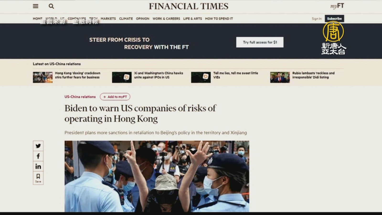英國金融時報預告,美國政府本週將發布警告,根據消息人士說,在香港的美國企業,可能面對來自中共當局的威脅,包括取得外國公司儲存在港資料、以及所謂「反外國制裁法」。報導引述5名知情人士透露,拜登政府13日稍晚,要更新川普政府去年就新疆發出的警告,建議美國企業確保供應鏈不涉及新疆強迫勞動,否則可能面臨法律風險。拜登政府還計劃本週宣布對中共施加更多制裁,回應中共鎮壓香港民主運動、對新疆的群體滅絕。 //asset2.ntdtv.com.tw/public/uploads/assets/2021/07/13/2021-07-13-60ed8c96c25a3.mp4 2021-07-13 20:55:19