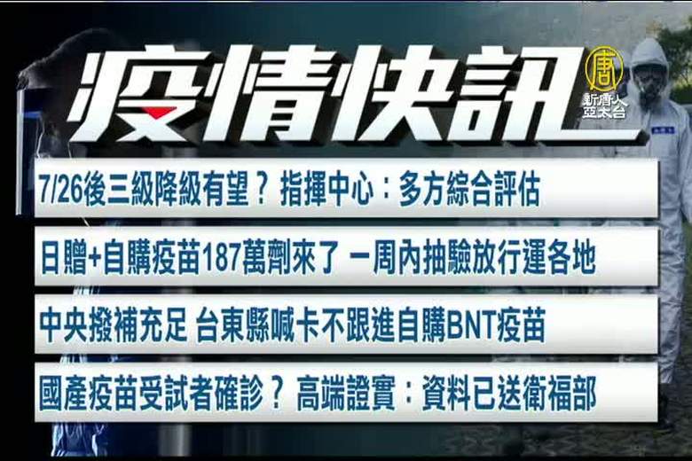 來看今天一組疫情快訊。七月26日之後,三級降級有望?指揮中心今天表示:需要多方綜合評估。日本捐贈以及自購疫苗187萬劑,今天抵台,將在一周內抽驗放行運至各地。中央撥補充足,台東縣今天宣布不跟進自購BNT疫苗。國產疫苗受試者確診?高端證實:資料已送衛福部。 //asset1.ntdtv.com.tw/public/uploads/assets/2021/07/15/2021-07-15-60f0288f5376c.mp4 以苗|中共肺炎|武漢肺炎|疫情|防疫|中共病毒2021-07-15 20:20:52